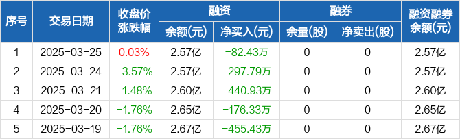融资方面,当日融资买入952.58万元,融资偿还1035.01万元,融资净偿还82.43万元,连续7日净偿还累计2037.12万元。融券方面,融券卖出0股,融券偿还0股,融券余量0股,融券余额0元。融资融券余额合计2.57亿元。