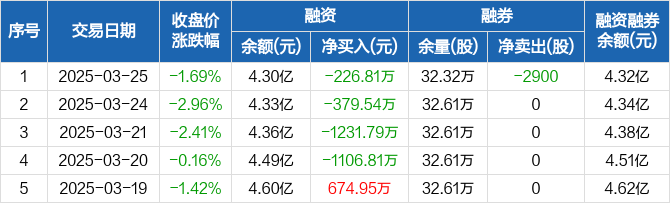 二六三融资融券信息显示,2025年3月25日融资净偿还226.81万元;融资余额4.3亿元,较前一日下降0.52%。