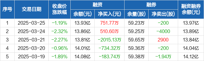 融资方面,当日融资买入5505.86万元,融资偿还4754.1万元,融资净买入751.77万元。融券方面,融券卖出0股,融券偿还200股,融券余量59.23万股,融券余额344.72万元。融资融券余额合计13.97亿元。