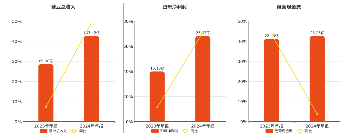 公司营业总收入为133.42亿元。归母净利润为25.87亿元。经营活动现金净流入为23.25亿元。