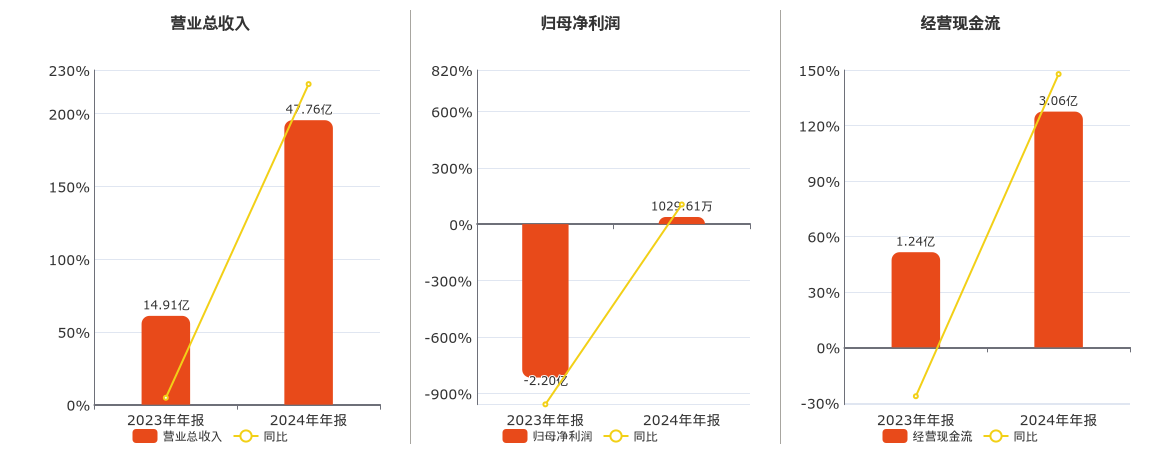 公司营业总收入为47.76亿元。归母净利润为1029.61万元。经营活动现金净流入为3.06亿元。