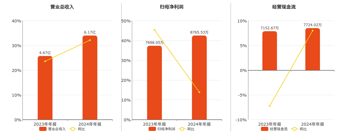 公司营业总收入为6.17亿元。归母净利润为8765.53万元。经营活动现金净流入为7724.02万元。
