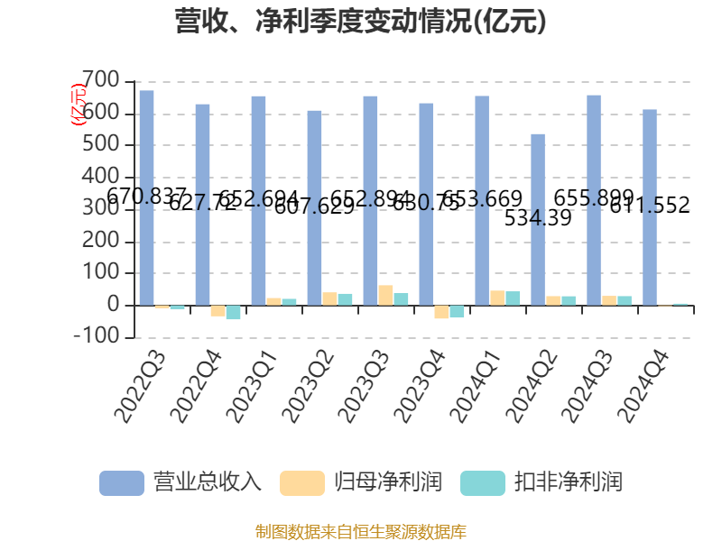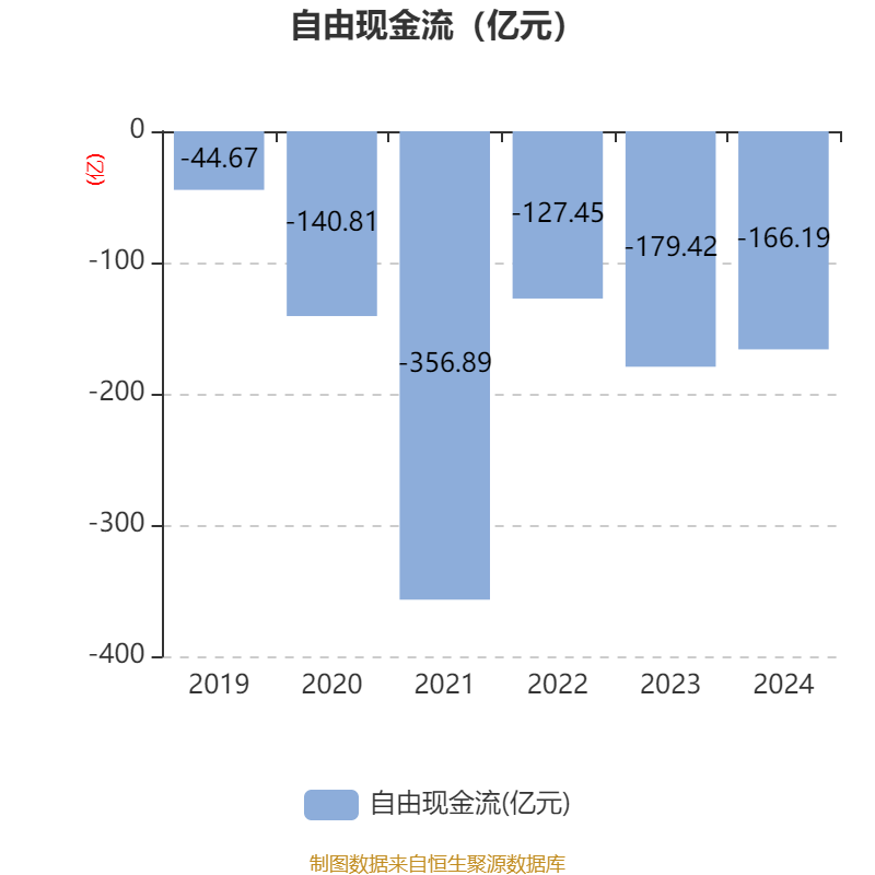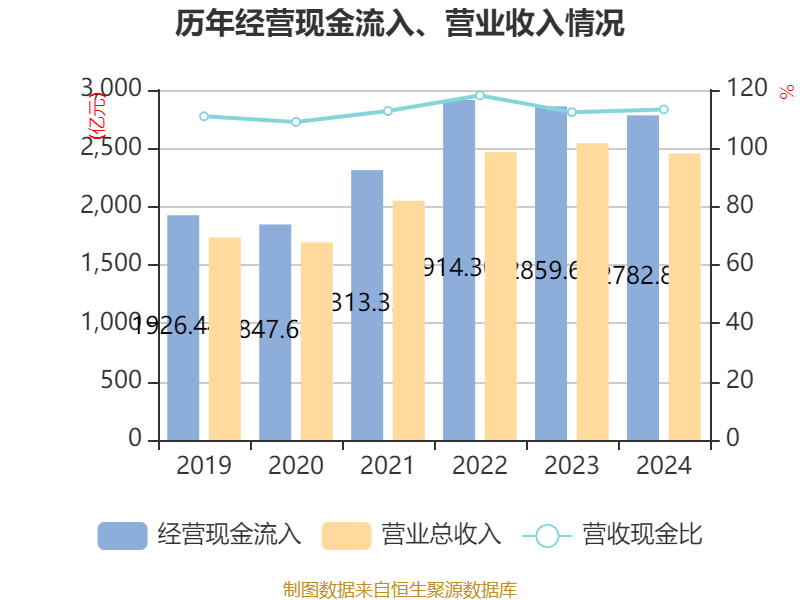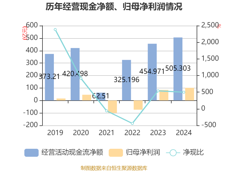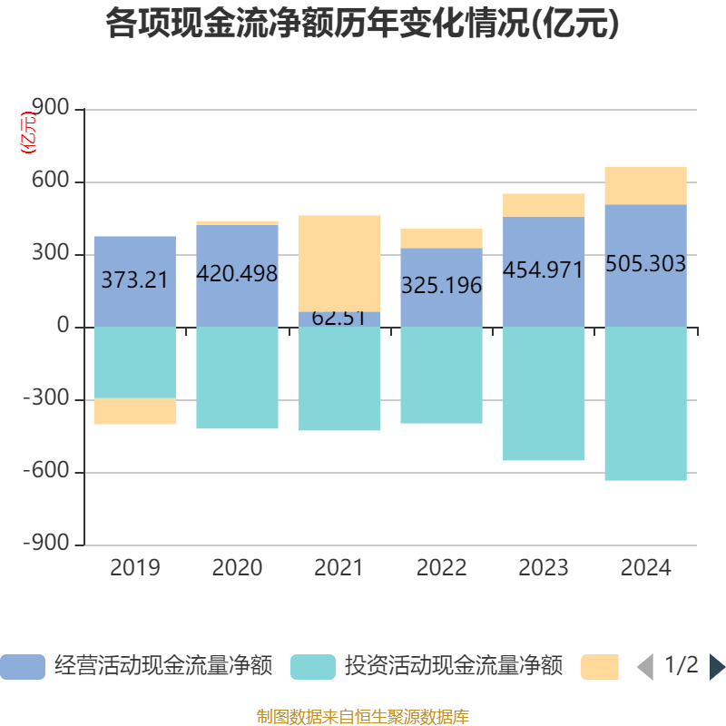 截至2024年,公司经营活动现金流净额为505.3亿元,同比增长11.06%;筹资活动现金流净额154.83亿元,同比增加60.67亿元;投资活动现金流净额-635.97亿元,上年同期为-552.26亿元。