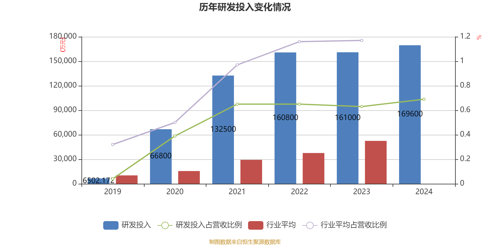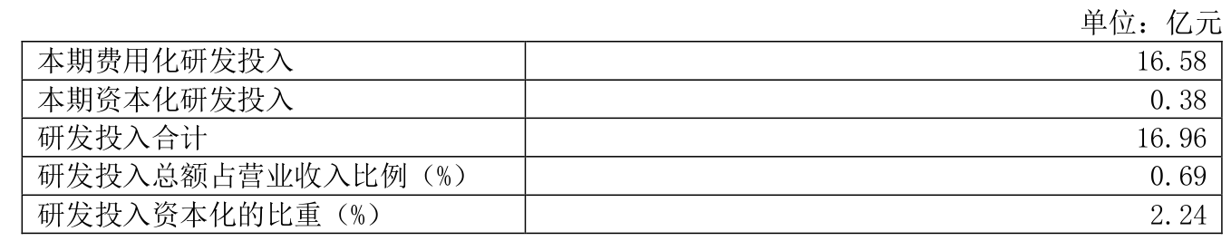 2024年全年,公司研发投入金额为16.96亿元,同比增长5.34%;研发投入占营业收入比例为0.69%,相比上年同期上升0.06个百分点。此外,公司全年研发投入资本化率为2.24%。