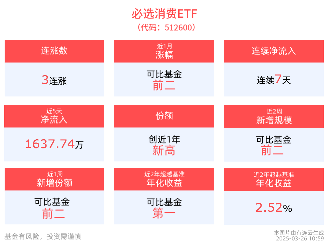 从资金净流入方面来看,必选消费ETF近7天获得连续资金净流入,最高单日获得655.93万元净流入,合计“吸金”2571.61万元。