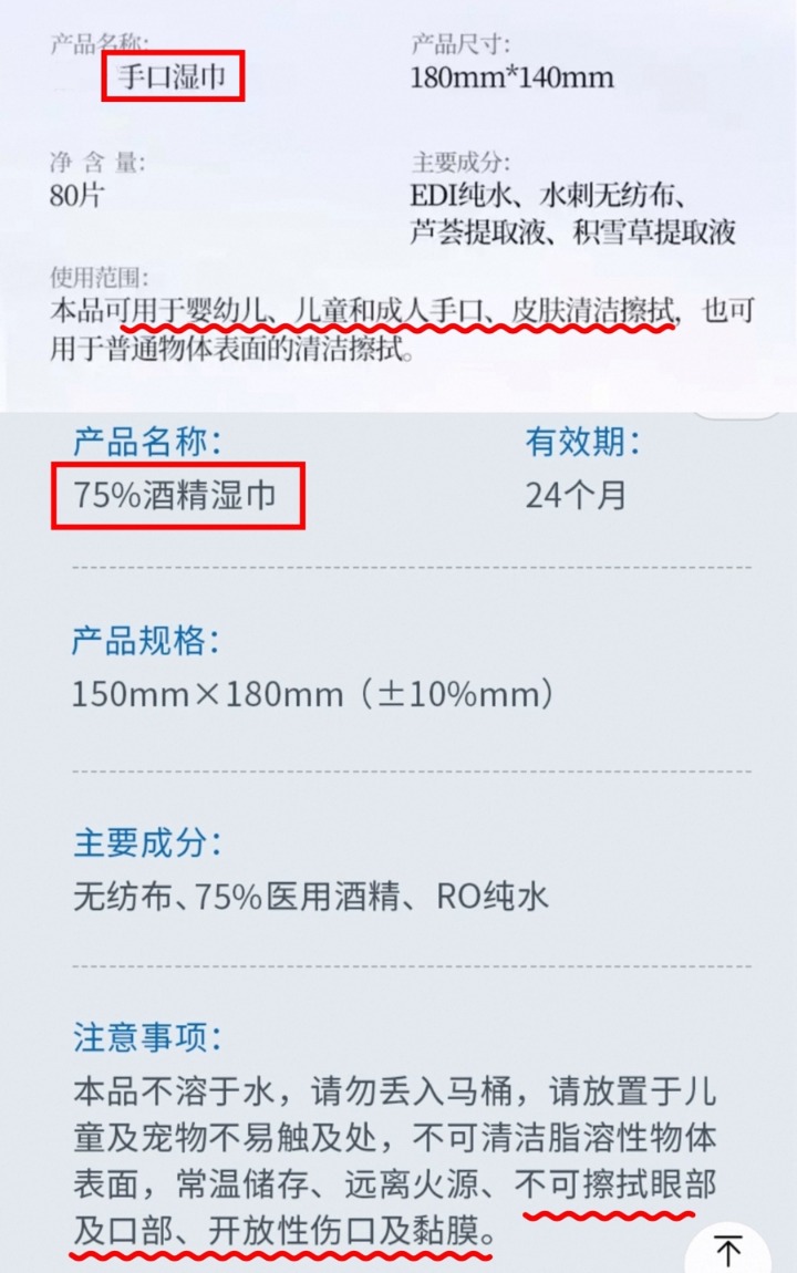 同样是湿巾,有的不能消毒,有的可以;有的能擦嘴,有的不能擦(图源:部分产品介绍)