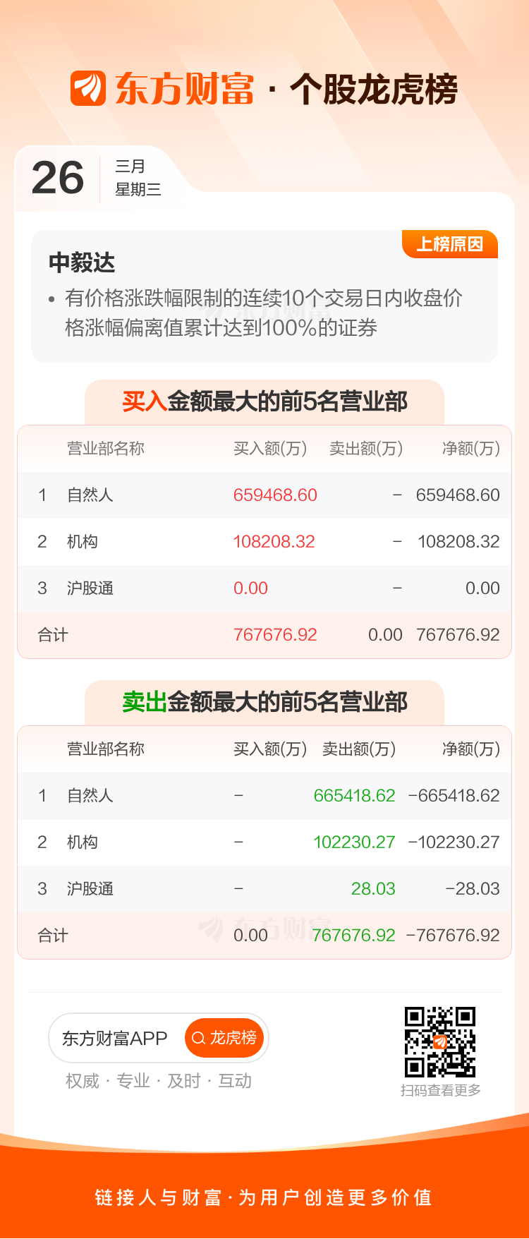 交易所2025年3月26日公布的交易公开信息显示,中毅达因成为有价格涨跌幅限制的连续10个交易日内收盘价格涨幅偏离值累计达到100%的证券上榜。中毅达当日收报10.6元,涨跌幅9.96%,换手率14.96%,成交额11.14亿。异常期间3月13日至3月26日,期间涨幅109.49%,累计偏离值109.59%,区间成交额76.77亿。