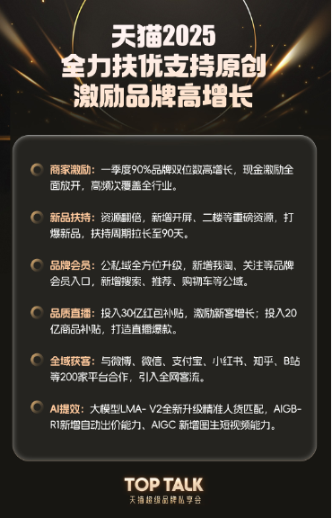 “优质品牌不单单是GMV头部品牌,更是有原创性有创造力,能引领消费需求创造出好产品获得新用户,产生黏性用户,可长期持续经营发展的品牌。”天猫总裁家洛表示,品牌每造一个超级新品都是一次抢占新客、抢占市场的绝佳机会,今年将从商家激励、新品扶持、品牌会员、品质直播、用户增长等方面投入力度空前的战略级资源,以领先的AI技术,打响优质品牌2025年的增长“战役”。