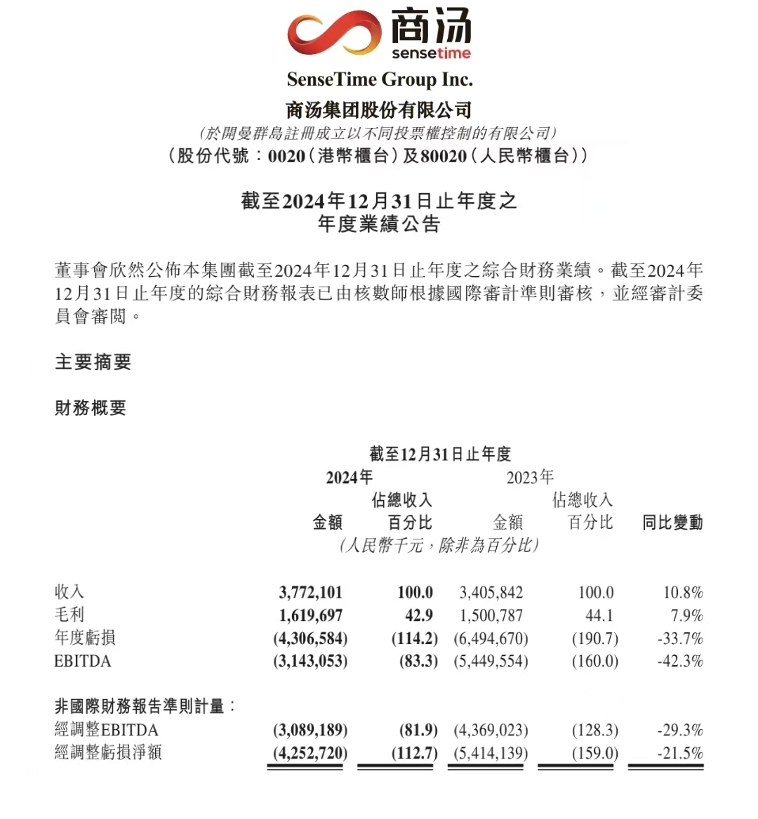 3月26日,商汤集团股份有限公司(「商汤集团」或「公司」,股份代号:0020)公布截至2024年12月31日止年度(「2024年」或「年内」) 之全年业绩。