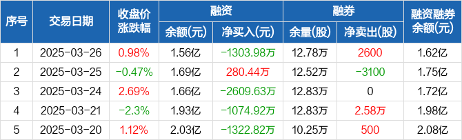新泉股份融资融券信息显示,2025年3月26日融资净偿还1303.98万元;融资余额1.56亿元,较前一日下降7.71%。