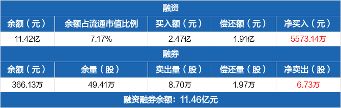 融资方面,当日融资买入2.47亿元,融资偿还1.91亿元,融资净买入5573.14万元。融券方面,融券卖出8.7万股,融券偿还1.97万股,融券余量49.41万股,融券余额366.13万元。融资融券余额合计11.46亿元。