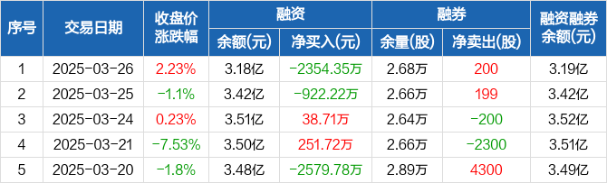融资方面,当日融资买入2775.95万元,融资偿还5130.3万元,融资净偿还2354.35万元。融券方面,融券卖出200股,融券偿还0股,融券余量2.68万股,融券余额83.68万元。融资融券余额合计3.19亿元。