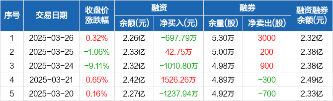 融资方面,当日融资买入1688.7万元,融资偿还2386.49万元,融资净偿还697.79万元。融券方面,融券卖出5800股,融券偿还2800股,融券余量5.3万股,融券余额592.86万元。融资融券余额合计2.32亿元。