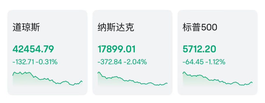关税“当头棒喝”之下,美股三大指数齐跌。截至当日收盘,道指跌132.71点,跌幅0.31%,报42454.79点;纳指跌372.84点,跌幅2.04%,报17899.01点;标普500指数跌64.45点,跌幅1.12%,报5712.20点。