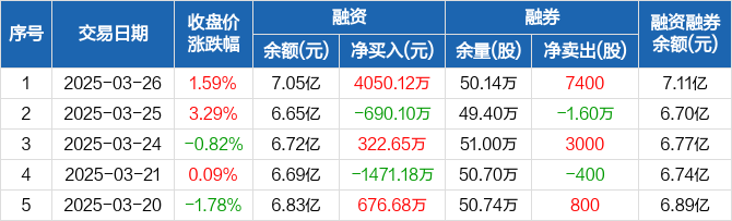 融资方面,当日融资买入9731.23万元,融资偿还5681.11万元,融资净买入4050.12万元。融券方面,融券卖出2.01万股,融券偿还1.27万股,融券余量50.14万股,融券余额576.11万元。融资融券余额合计7.11亿元。