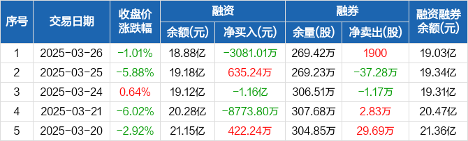 融资方面,当日融资买入1.02亿元,融资偿还1.33亿元,融资净偿还3081.01万元。融券方面,融券卖出2000股,融券偿还100股,融券余量269.42万股,融券余额1578.82万元。融资融券余额合计19.03亿元。