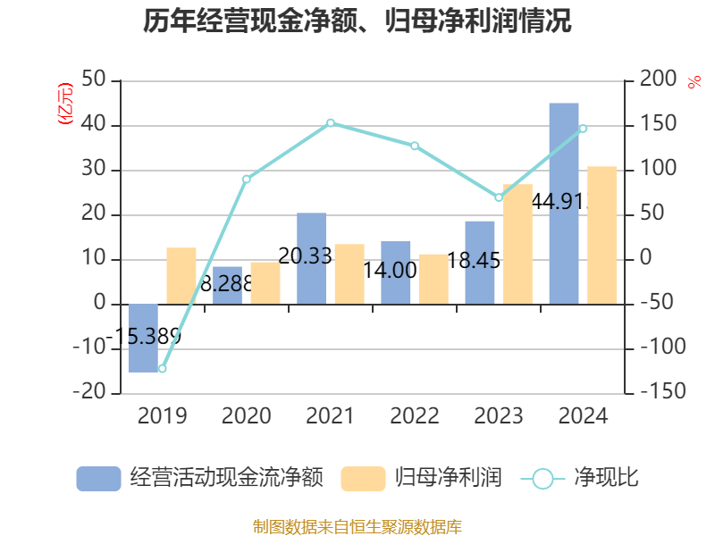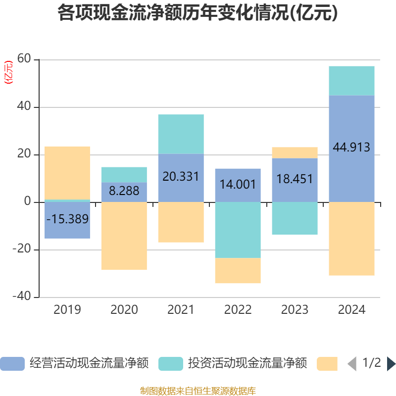 截至2024年,公司经营活动现金流净额为44.91亿元,同比增长143.43%;筹资活动现金流净额-30.95亿元,同比减少35.56亿元;投资活动现金流净额12.23亿元,上年同期为-13.75亿元。