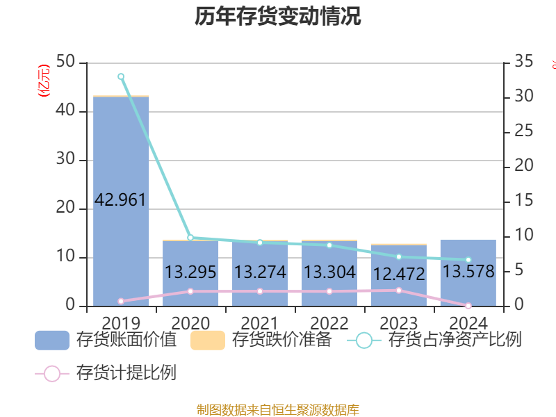 从存货变动来看,截至2024年末,公司存货账面价值为13.58亿元,占净资产的6.62%,较上年末增加1.11亿元。公司本期没有计提存货跌价准备。