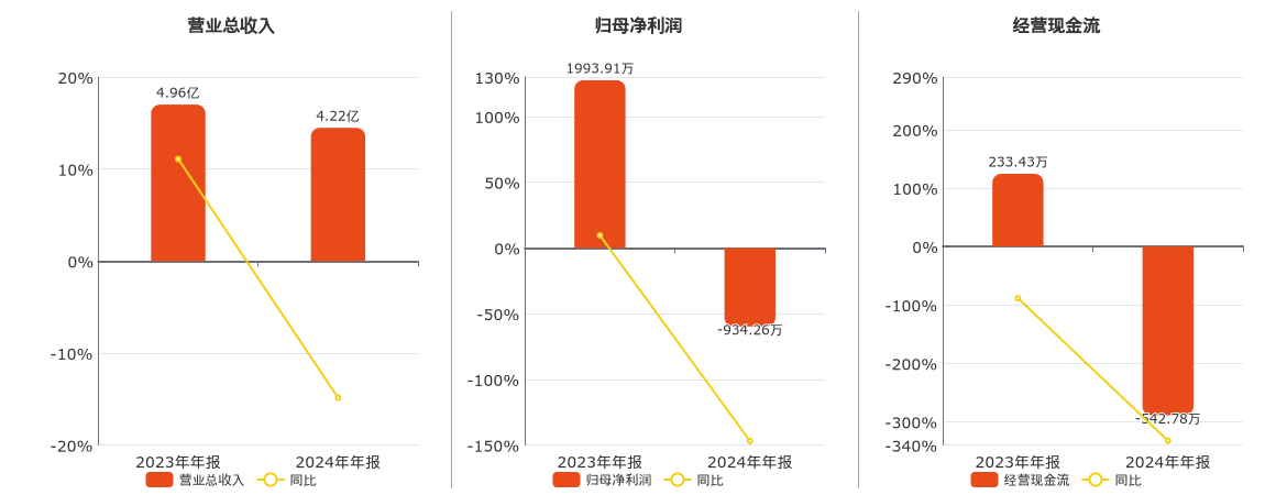 公司营业总收入为4.22亿元,较去年同报告期营业总收入减少7361.07万元,同比较去年同期下降14.85%。归母净利润为-934.26万元,较去年同报告期归母净利润减少2928.17万元,同比较去年同期下降146.86%。经营活动现金净流入为-542.78万元,较去年同报告期经营活动现金净流入减少776.20万元,同比较去年同期下降332.53%。