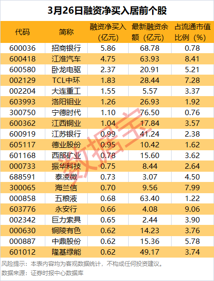 具体到个股,3月26日获融资净买入千万元以上的有280只,其中29只融资净买入额超5000万元。招商银行融资净买入额居首,当日净买入5.86亿元;其次是江淮汽车、卧龙电驱,融资净买入金额分别为4.75亿元、2.37亿元,融资净买入金额居前的还有TCL中环、大连重工、洛阳钼业等。