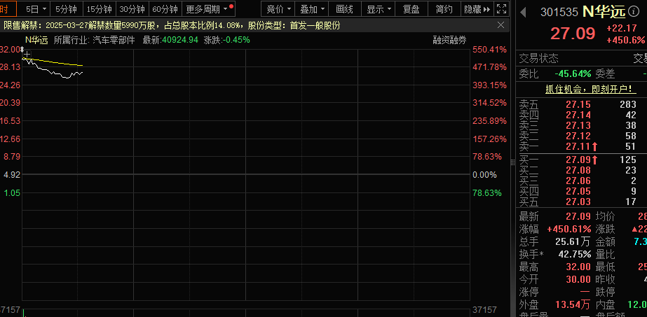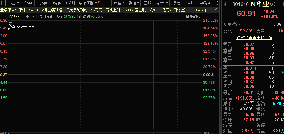 今日共有两只新股上市,N华远开盘价30.00元,上涨509.76%;N华业开盘价57.15元,上涨173.84%。