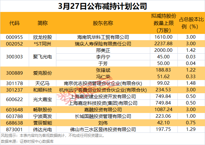 3月27日共有11家公司披露股东减持计划,拟减持股份比例居前的有欣龙控股、*ST同洲、和顺科技、畅联股份等。