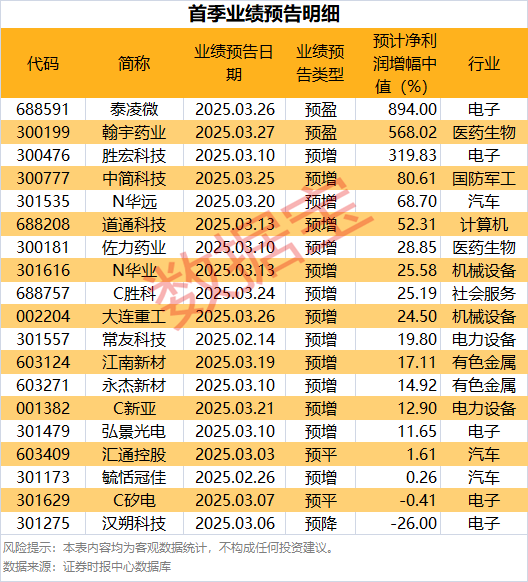 以首季净利润增幅中值统计,泰凌微、翰宇药业、胜宏科技净利润增幅中值超100%。