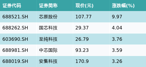 截至早盘收盘,国家大基金持股主题涨跌幅最高的五只股票为:芯原股份(688521.SH)、国芯科技(688262.SH)、至纯科技(603690.SH)、中芯国际(688981.SH)与安集科技(688019.SH)。详情见下表: