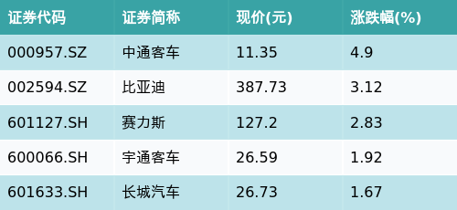 截至早盘收盘,汽车整车主题涨跌幅最高的五只股票为:中通客车(000957.SZ)、比亚迪(002594.SZ)、赛力斯(601127.SH)、宇通客车(600066.SH)与长城汽车(601633.SH)。详情见下表: