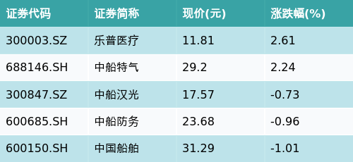 截至收盘,中船系主题涨跌幅最高的五只股票为:乐普医疗(300003.SZ)、中船特气(688146.SH)、中船汉光(300847.SZ)、中船防务(600685.SH)与中国船舶(600150.SH)。详情见下表: