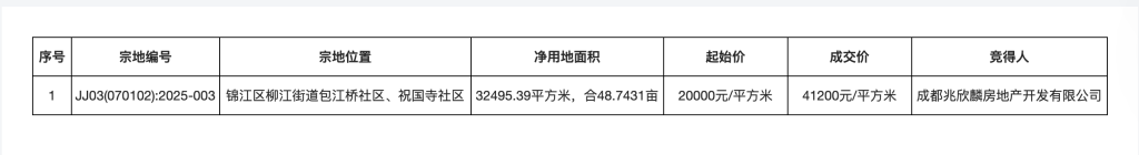 据机构监测数据,该地块吸引了远达、成都交子金融、仁和、华发、锦江统建&金茂、华润置地、中海、建发、中旅、招商蛇口共10位竞买人参与竞争,经过213轮竞拍,历时1小时20分钟,最终建发旗下成都兆欣麟房地产开发有限公司以楼面价41200元/平方米竞得该地块,成交总价约33.47亿元,溢价率106%。