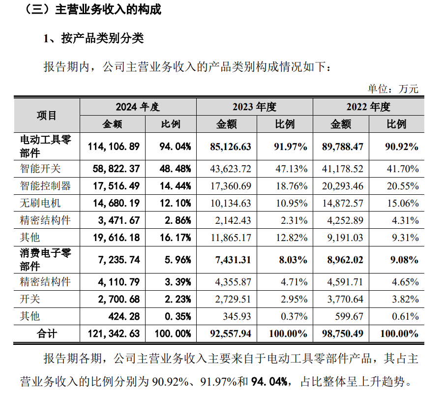 公司把主营业务收入产品分为电动工具零部件和消费电子零部件,其中消费电子零部件过去三年占比低于10%,且呈现逐年下降的趋势,公司业务增长主要来自电动工具零部件,后者包含智能开关、智能控制器、无刷电机、精密结构件和其他,不过该品类中的增长主要来自“智能开关”和“其他”,智能控制器、无刷电机和精密结构件均是负增长。从营收占比看,即便是排名第一的智能开关,报告期营收营收分别为4.12亿元、4.36亿元和5.88亿元,但占比从未超过50%。