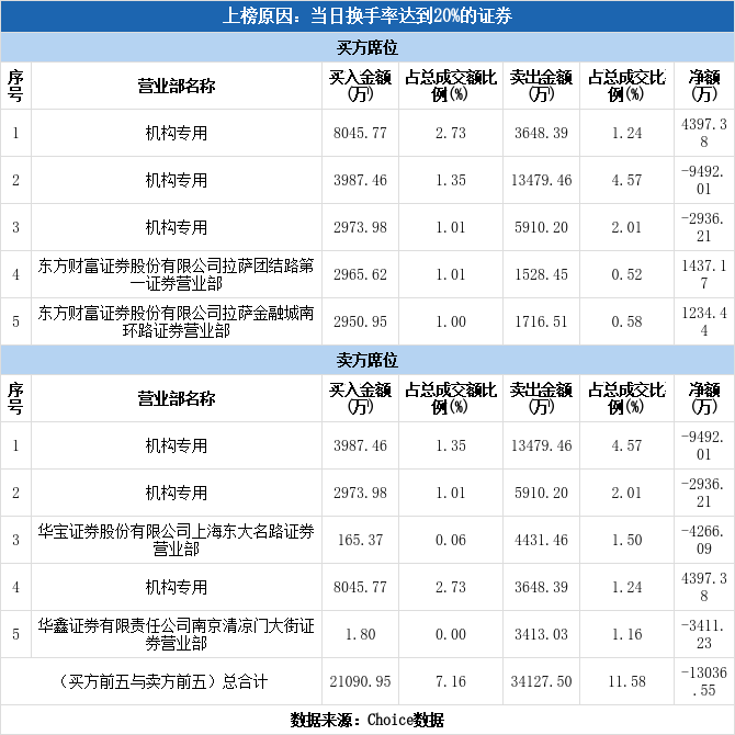 龙虎榜数据显示,今日共6个机构席位出现在龙虎榜单上,分别位列买一、买二、买三、卖一、卖二、卖四,合计净卖出8030.84万元,占龙虎榜净卖额的61.6%。除此之外还有新莱应材、南方精工、N浙江华远等31只个股榜单上出现了机构的身影,其中13家呈现机构净买入,获净买入最多的是N浙江华远,净买额为5318.77万元;18家呈现机构净卖出,其中遭净卖出最高的为新莱应材,净卖额为9313.93万元。