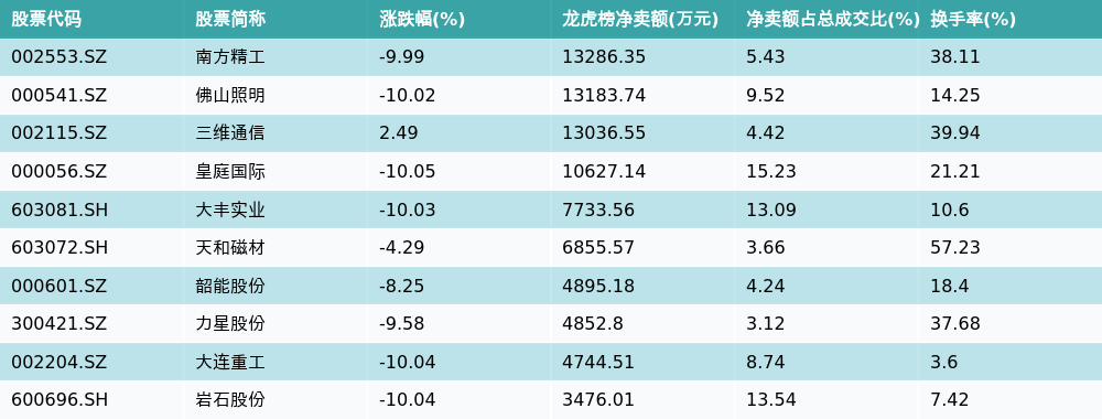 南方财经3月27日电,南财金融终端数据显示,因当日异动登上龙虎榜的个股中,龙虎榜中资金净流出最多的前三位分别是南方精工(002553.SZ)、佛山照明(000541.SZ)与三维通信(002115.SZ)。其中排名第一的南方精工被净卖出1.33亿元,占总成交金额的5.43%。南方精工收盘下跌9.99%,换手率为38.11%。净卖出额前10个股详情见下图: