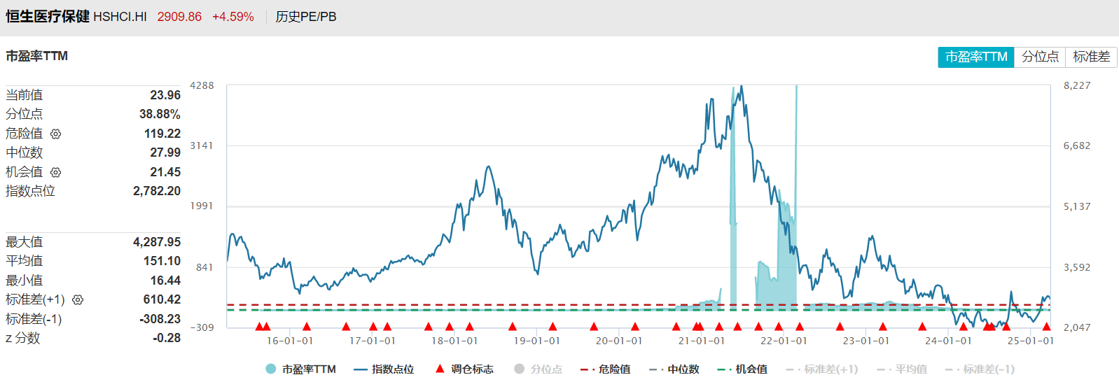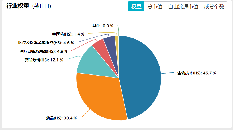 恒生医疗保健指数:反映恒生综合指数里主要经营医疗保健业务成份股公司的表现,现有成份股68只,涵盖制药、生物科技、医疗器械、医疗服务、互联网医疗等多个细分领域。个股平均市值约301亿元。