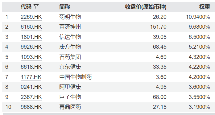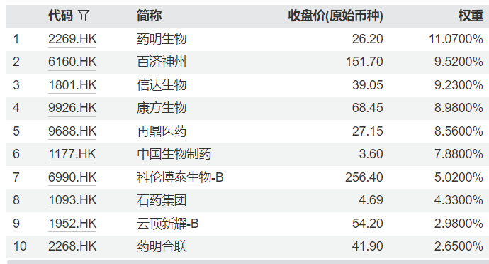 恒生医疗保健指数:覆盖成分股数量多,行业覆盖度广,前十大权重股占比相对较低,但也达到了55.41%,成分股较为均衡,对中小型药企覆盖较多。