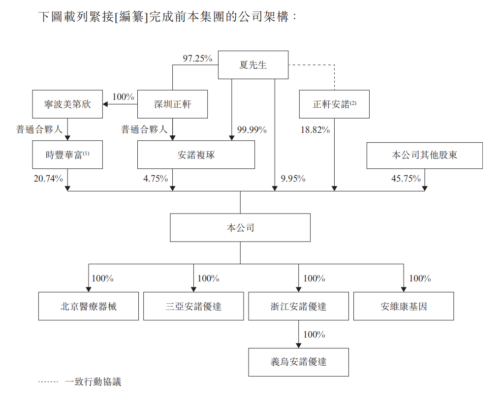 在目前的股权结构中,分别由夏佐全、安诺复琢、时丰华富及正轩安诺直接持有9.95%、4.75%、20.74%及18.82%的权益。安诺复琢的普通合伙人为深圳正轩,而深圳正轩由夏佐全拥有97.25%的权益;时丰华富的普通合伙人为宁波美第欣,宁波美第欣由深圳正轩全资拥有。