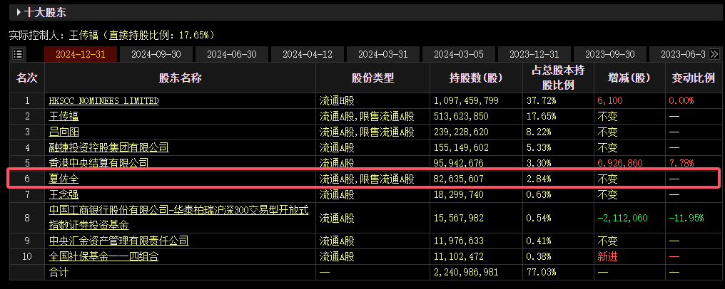 最新数据显示,夏佐全目前个人仍位列比亚迪前十大股东之列,持股比例为2.84%,持股数达8263万股,总市值超过300亿元。