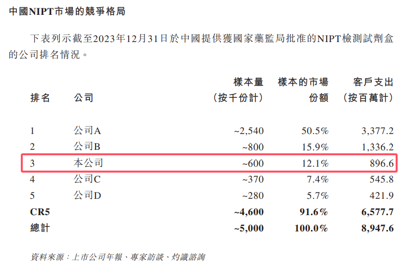 目前,安诺优达的NIPT试剂盒(旨在检测三种最常见的染色体疾病(21、18及13三体综合征))于2017年获得三类医疗器械证书,使得安诺优达成为中国首批实现这一里程碑的少数公司之一。安诺优达已因此在产前检测市场站稳脚跟并占据重大市场份额。根据灼识咨询的资料,按样本检测量计量,2023年,安诺优达在中国NIPT市场位列第三,在2021年、2022年及2023年的市场份额分别持续增长9.6%、11.6%及12.1%。