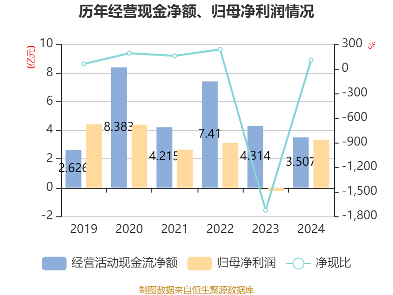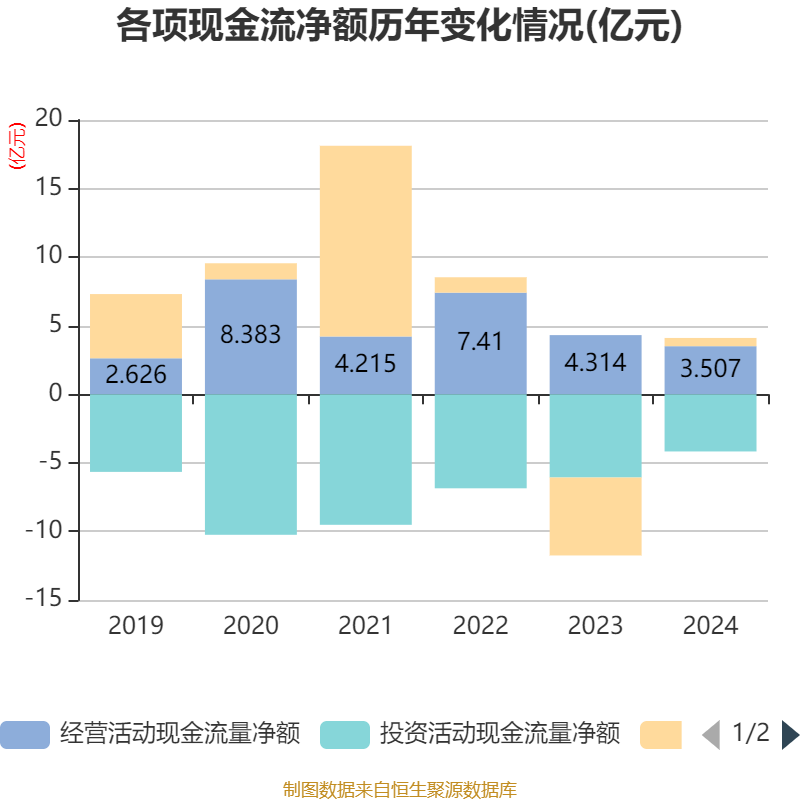 截至2024年,公司经营活动现金流净额为3.51亿元,同比下降18.7%;筹资活动现金流净额6010.8万元,同比增加6.28亿元;投资活动现金流净额-4.17亿元,上年同期为-6.07亿元。
