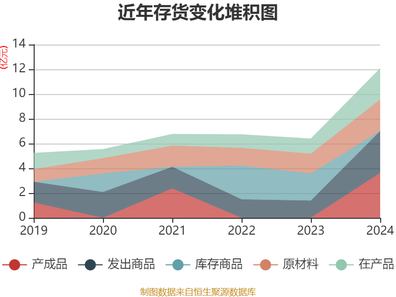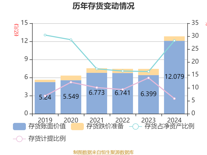 从存货变动来看,截至2024年末,公司存货账面价值为12.08亿元,占净资产的28.27%,较上年末增加5.68亿元。其中,存货跌价准备为7486.13万元,计提比例为5.84%。
