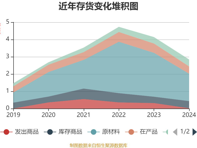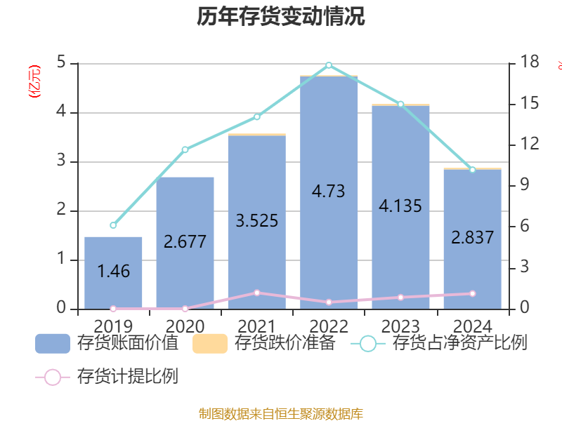 从存货变动来看,截至2024年末,公司存货账面价值为2.84亿元,占净资产的10.18%,较上年末减少1.3亿元。其中,存货跌价准备为317.3万元,计提比例为1.11%。