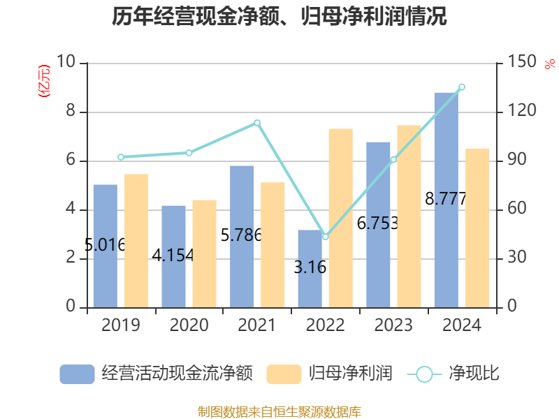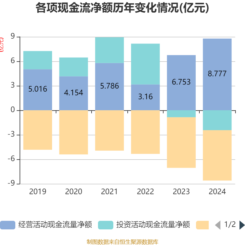 截至2024年,公司经营活动现金流净额为8.78亿元,同比增长29.96%;筹资活动现金流净额-6.17亿元,同比增加256.43万元;投资活动现金流净额-2.44亿元,上年同期为-8581.3万元。