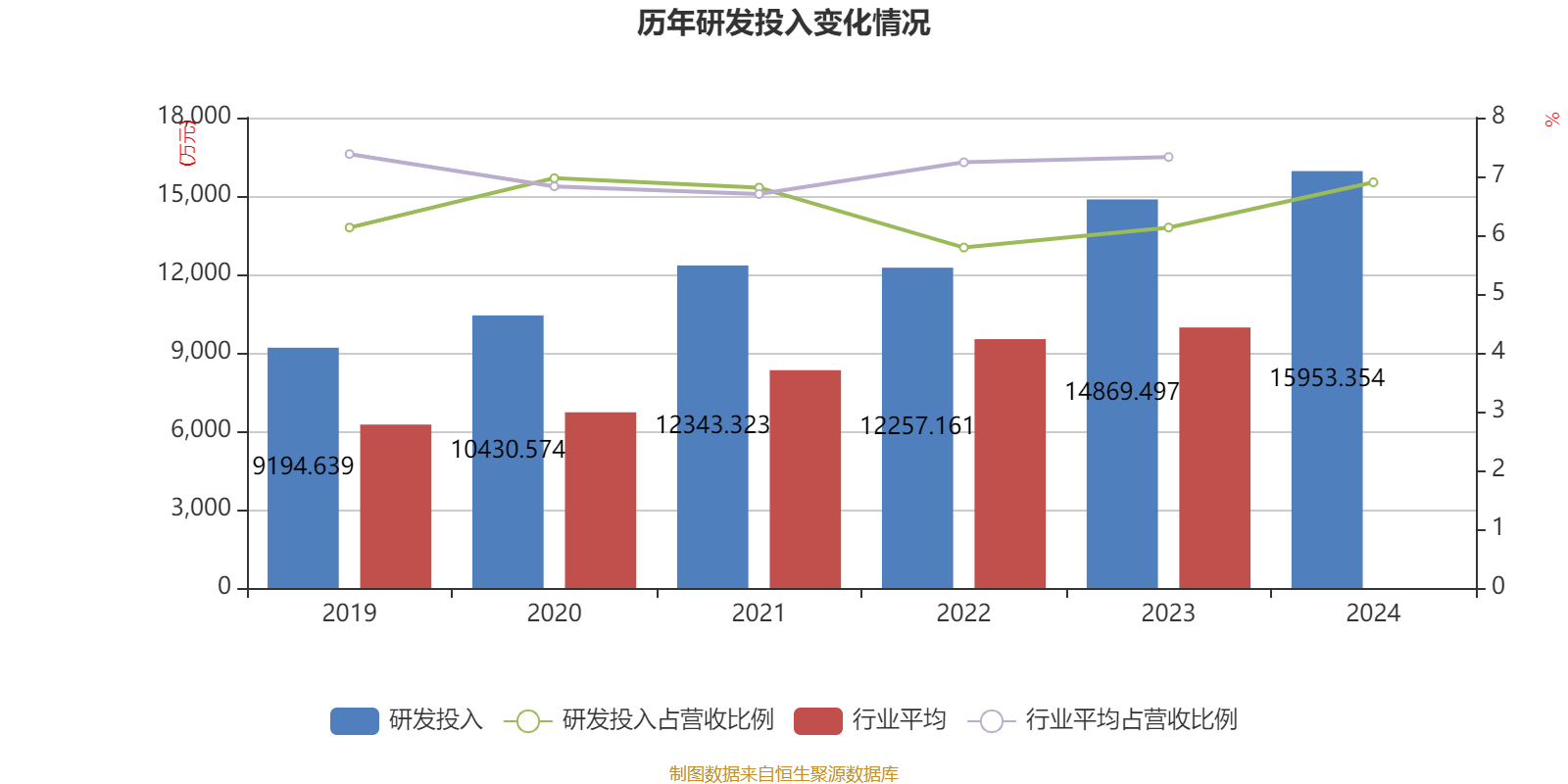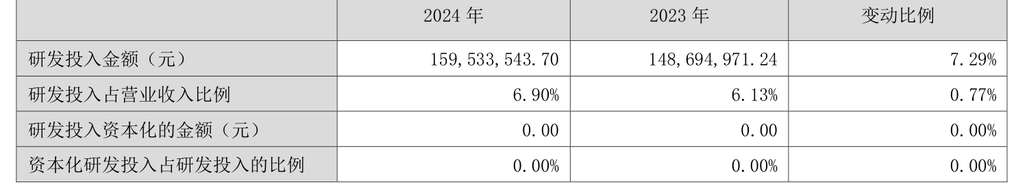 2024年全年,公司研发投入金额为1.6亿元,同比增长7.29%;研发投入占营业收入比例为6.9%,相比上年同期上升0.77个百分点。此外,公司全年研发投入资本化率为0%。