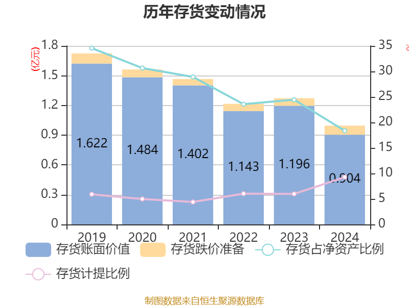 从存货变动来看,截至2024年末,公司存货账面价值为9035.98万元,占净资产的18.36%,较上年末减少2922.19万元。其中,存货跌价准备为922.73万元,计提比例为9.27%。