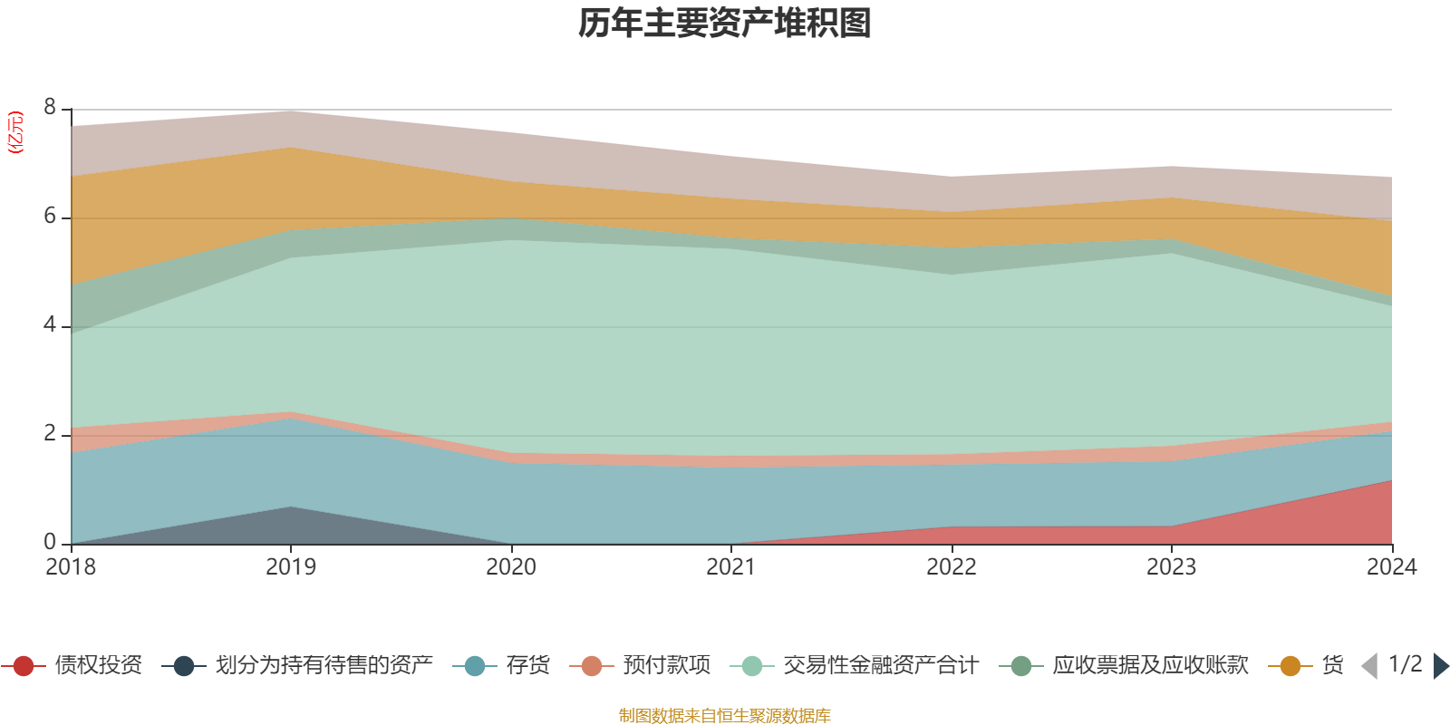资产重大变化方面,截至2024年末,公司交易性金融资产合计较上年末减少40.03%,占公司总资产比重下降19.51个百分点;债权投资较上年末增加262.62%,占公司总资产比重上升12.65个百分点;货币资金较上年末增加82.41%,占公司总资产比重上升9.56个百分点;一年内到期的非流动资产占公司总资产的4.92%,上年末为0。