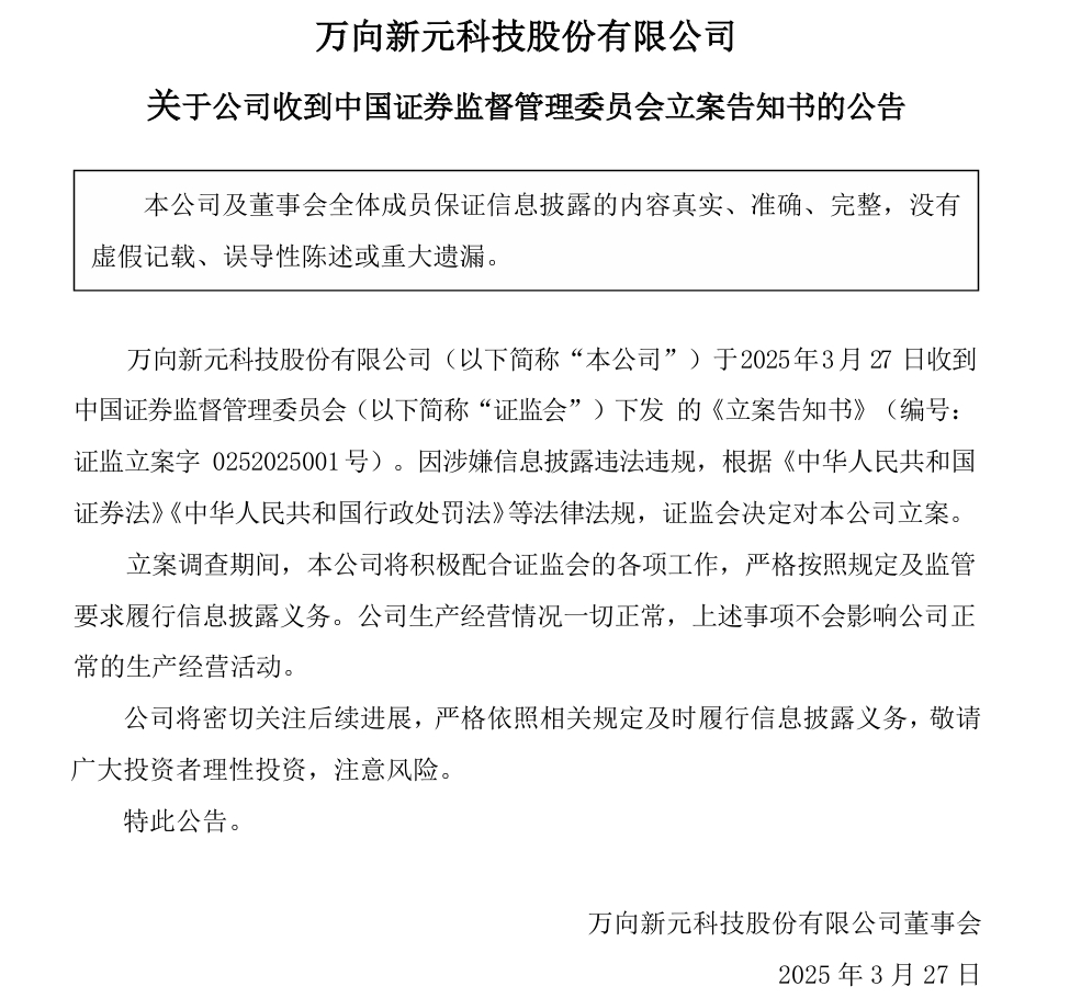 3月27日晚间,新元科技(300472.SZ,股价7元,市值19.27亿元)公告,公司于2025年3月27日收到中国证监会下发的《立案告知书》,因涉嫌信息披露违法违规,根据《中华人民共和国证券法》《中华人民共和国行政处罚法》等法律法规,证监会决定对公司立案。