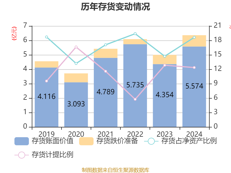 从存货变动来看,截至2024年末,公司存货账面价值为5.57亿元,占净资产的18.62%,较上年末增加1.22亿元。其中,存货跌价准备为7851.82万元,计提比例为12.35%。