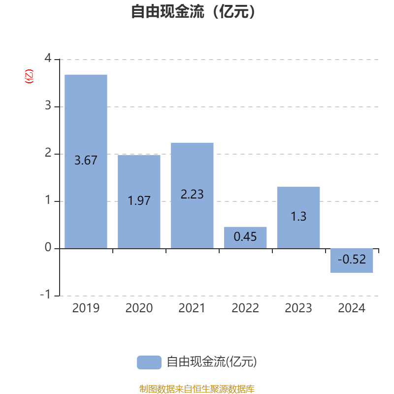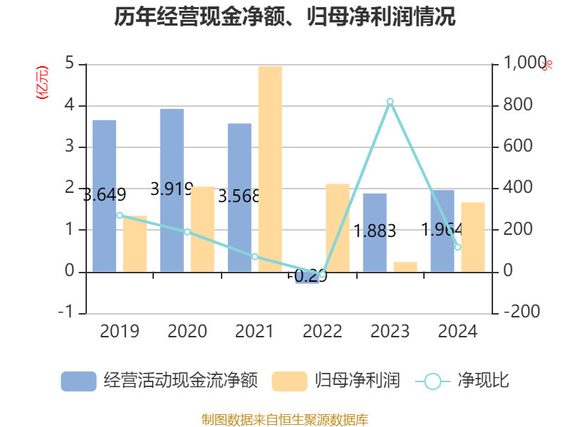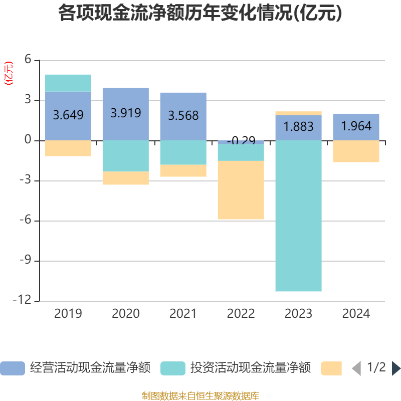 截至2024年,公司经营活动现金流净额为1.96亿元,同比增长4.26%;筹资活动现金流净额-1.63亿元,同比减少1.92亿元;投资活动现金流净额133.45万元,上年同期为-11.3亿元。