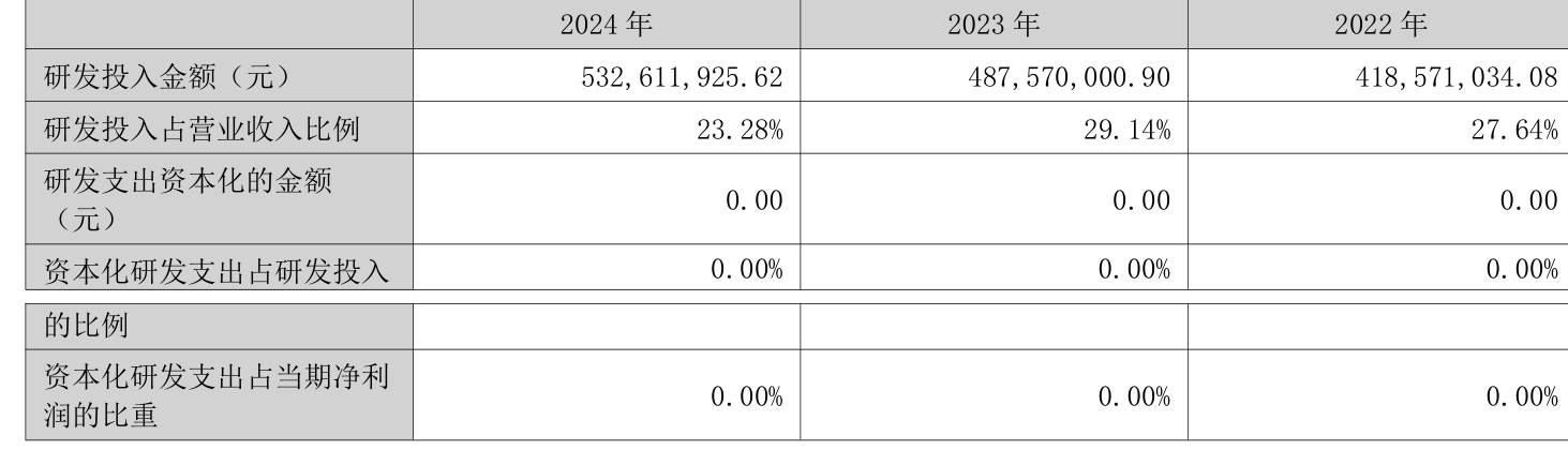 2024年全年,公司研发投入金额为5.33亿元,同比增长9.24%;研发投入占营业收入比例为23.28%,相比上年同期下降5.86个百分点。此外,公司全年研发投入资本化率为0%。